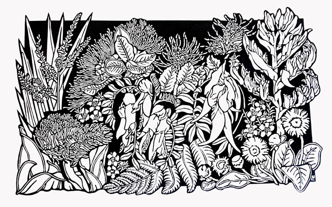 I finally made it into the studio to print this morning! This is an image of the first print off the block. The next step is waiting for it to dry and then handcolouring. I use an oil based ink to print the black which can take a few days to dry depending on the weather. I then do a sample handcoloured print working out exact colours – within the designing process I had already made the major decisions about the general colours I would use so it is a refining process at this stage. I usually mark on this ‘master’ the names and sample of all the colours I use for each flower/foilage.