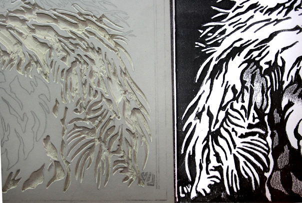 Linoblock carving with templateToday I am working on carving a new linocut. I will just show you a section of the linoblock I am carving with the section of the design I am working from.