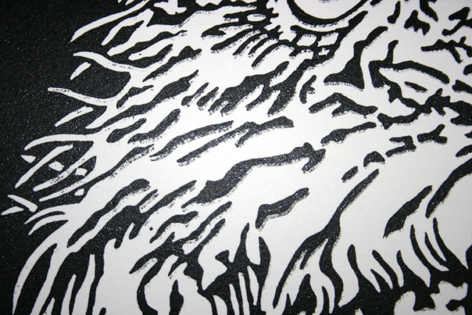 The above problems with uneven pressure can also be caused by not putting enough ink on the linoblock or missing sections – as seen on the left. The opposite can also occur with the over-inking of the linoblock – as seen on the right. This can happen as easily as under-inking ! It is essentially when you try and roll too much ink on the block – this could be to avoid under-inking. It means the finer carving work such as fine lines “fill in” or you end up with raised lines of ink around the edges of the carved or white sections or you can see a ‘texture’ of ink on the surface of the dried print. I find viewing the inked linoblock against the light to check the ink levels can help – sometimes you can see some of these problems – add additional ink or print this over-inked block on cheap paper and remove excessive ink before moving back to the editioned prints.