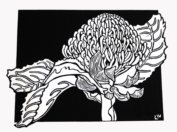 In this discarded print you can see small white patches where the ink has not been evenly applied. Essentially the aim is to get an even coating of ink transferring from the linoblock to the final editioned prints. There will nearly always be small imperfections in hand pulled print, however, in the wattle print above and the close-up of another print below – this level of uneven printing would indicate that I needed to discard these particular prints from an edition. Also check your roller has no imperfections (small indents, chips) causing small areas to not pick up ink evenly and therefore not transferring ink evenly. If hand burnishing then try and make sure you work in a pattern across the print. With a press sometimes turning the print around running the print through a second time helps if the press is not giving even pressure.