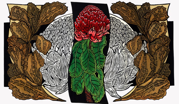 I finally completed the ‘Waratahs’ linocut today. I have called it “Regeneration”. After the destruction that occurs in bushfires the waratah ‘regenerates’ from a ‘lignotuber’ which is a type of starchy or woody swelling found partly or fully on underground stems – like a life support system.