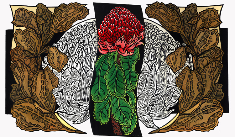 I finally completed the ‘Waratahs’ linocut today. I have called it “Regeneration”. After the destruction that occurs in bushfires the waratah ‘regenerates’ from a ‘lignotuber’ which is a type of starchy or woody swelling found partly or fully on underground stems – like a life support system. In this print the outside leaves that are … Continue reading “Regeneration” – Waratahs Linocut…Linoprint