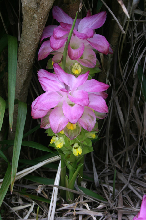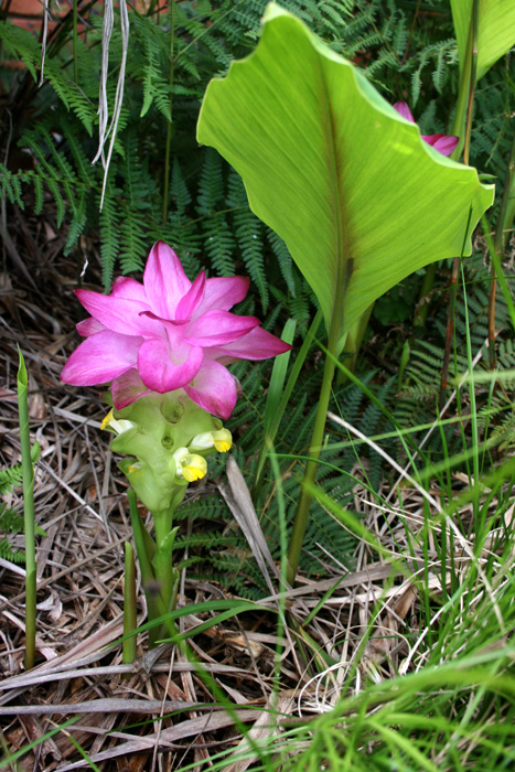 Over the past month the Cape York Lily – Curcuma australasica – that remains underground and dormant springs to life! It starts with these large gorgeous leaves that rise out og the ground and unfurl with striped ridges. It is then followed by the flowers that start as green stalks and open with the flourescent pink flowers.