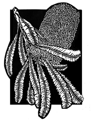 In my previous post I noted I have been looking at banksias lately and in particular Banksia serrata from my garden. I have been photographing my own plant for a while but also looking at design ideas on small scraps of paper etc. I have used Banksia serrata – Saw Banksia previously for a linocut but this was a very long time ago. I also completed one illustration a while ago. After working from the plant and then photographs I did a drawing of one of the Banksia serrata flowers with their lovely serrated leaves. I love the sweep of leaves down and across.