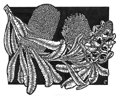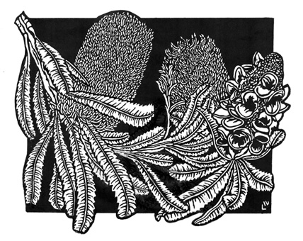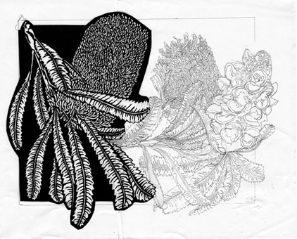 After working through design ideas and adding them lightly over the template (size/shape of the basic linocut from the DESIGNART series) I settled on the seedpod over to the right of the template and spilling off. It needed something else so after consulting my plant and photos I decided to add a more ‘ragged’ representation of the flower head after it has opened and is starting to head towards fading from its robust bloom into the ‘softer’ and then wilted phase leading to the seedpods. This is the added on drawing I came up with.