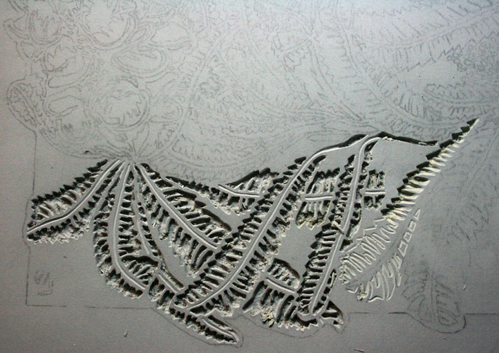 Just a quick note just to show the very slow progress (due to things like unexpected trips to Sydney) on carving the banksias design. It is also a bit challenging to place all those veins in from the perspective of carving with lino that can be soft and pliable and therefore easily chipped out where you don’t want it chipped out. So slow and steady is the best way to go.