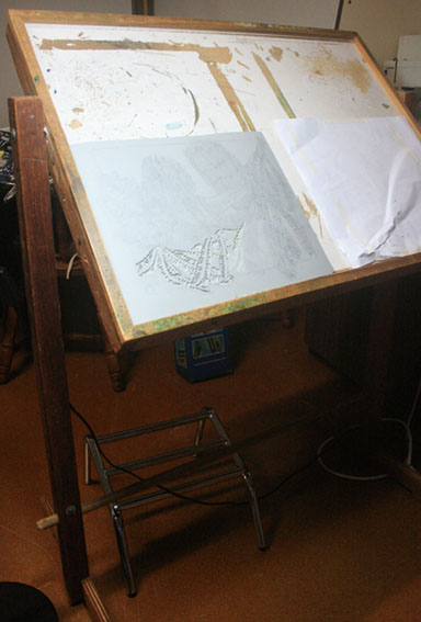 I thought I would also show the table I use for drawing, carving and painting my designs. It is based around a tapestry stand idea but is a lot sturdier and has a flat drawing board with an edge around it where you can sit your paper or lino. My dad made me this one about 28 years ago when I was doing art for my HSC. I have renewed the drawing board top once and that’s about it in all that time.