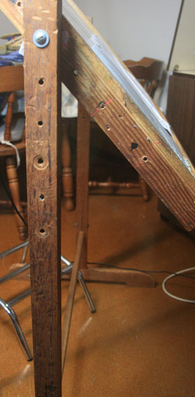 As you can see I can tip the table to adjust the angle I am working on and hold it in place by tightening the wing nuts on the large bolt that goes through the side stand and board. The image on the right shows the side view indicating the holes in the stand and board to raise and lower the height of board as needed. I can also have the drawing board horizontal or vertical depending on what I am working on. I use a comfortable office chair to sit on so that I can also raise and lower the height of the chair.