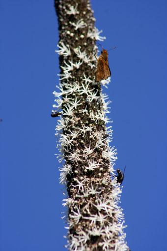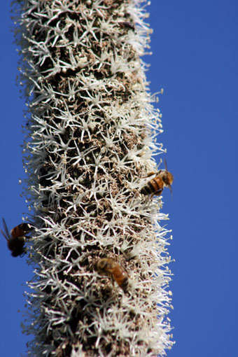 The small white flowers appear steadily on long spikes and are heavily laden with nectar which attracts many insects and birds.