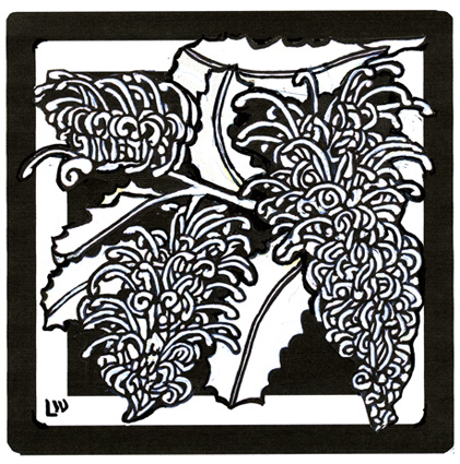 I do enjoy your black backgrounds with thick black frames that you do in your artwork. The square format suits these flower compositions nicely. Thanks for talking about your process for developing an image. I also find myself scanning, photocopying, cutting, taping, inking, and so forth, to come up with a final design. I enjoy that part of the process.