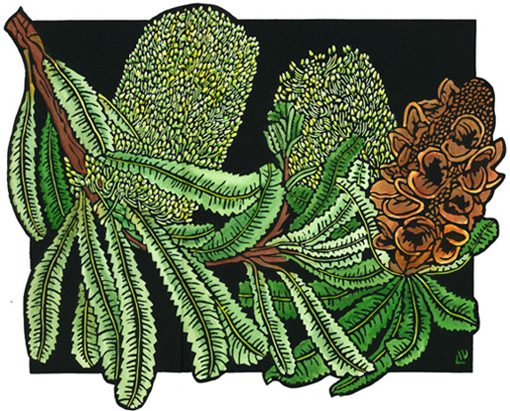 I have finally finished this Banksia serrata linocut – after designing 1, designing 2, designing 3, carving, printing and last night handcolouring it’s done!