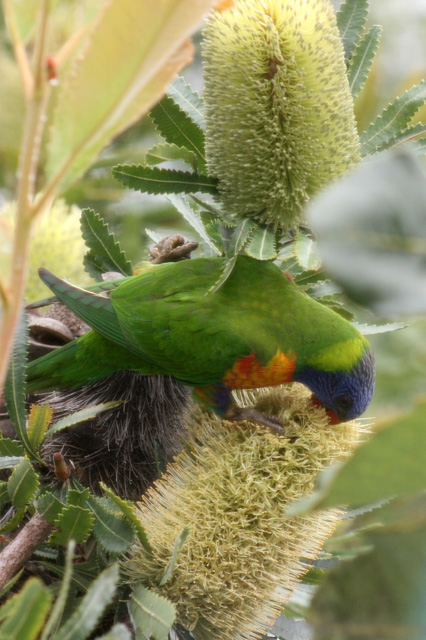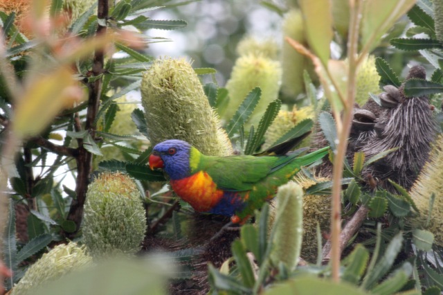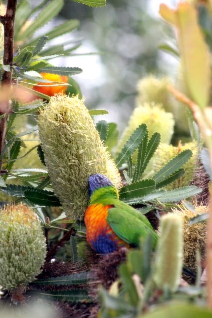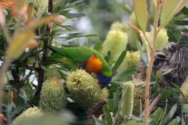 2 thoughts on “Out of my studio window – Banksias and Rainbow Lorikeets