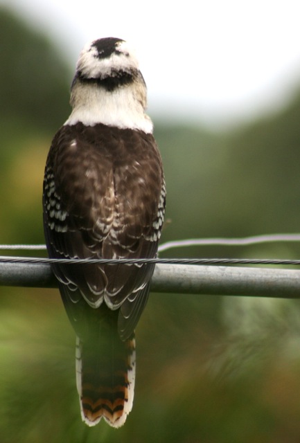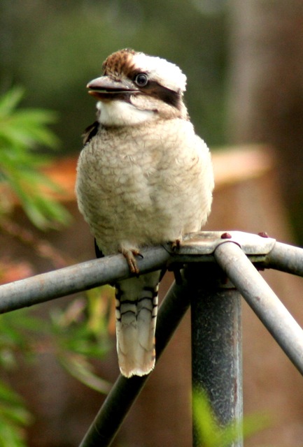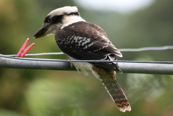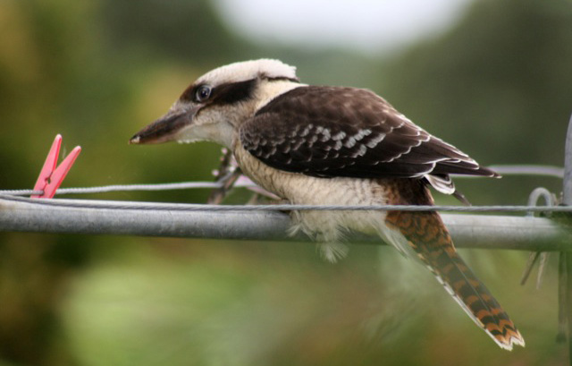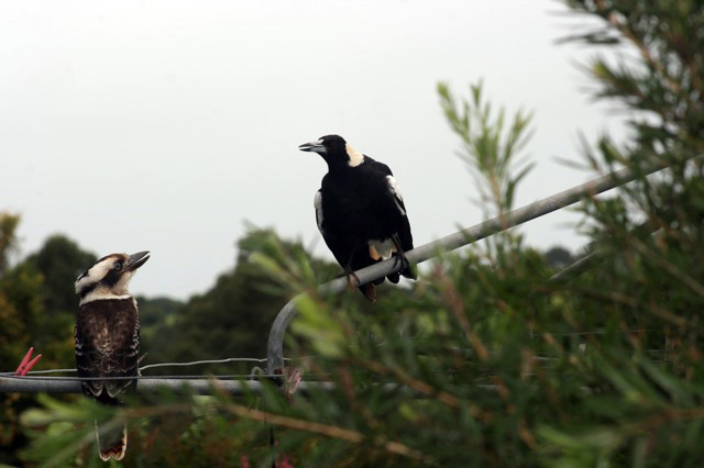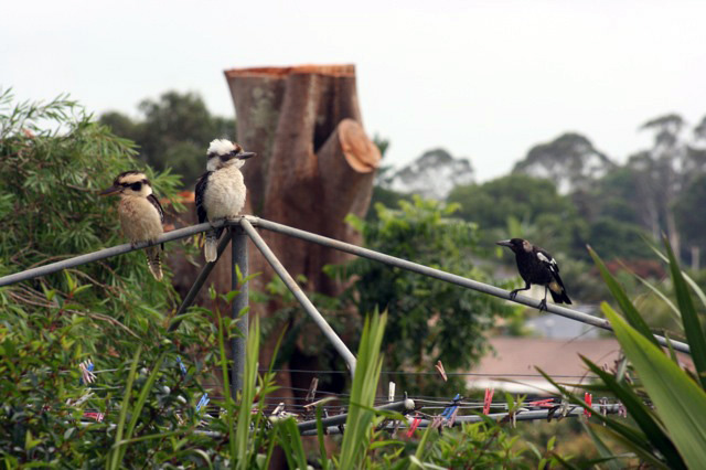 There was quite a ‘kuffle’ the other morning when a local magpie family crossed beaks with this local kookaburra family over territory and food.The adult magpie was stalking the young kookaburra trying to run it off this clothes line but the kookaburra quite sure of itself was having nothing of that and remained on the clothes line.
