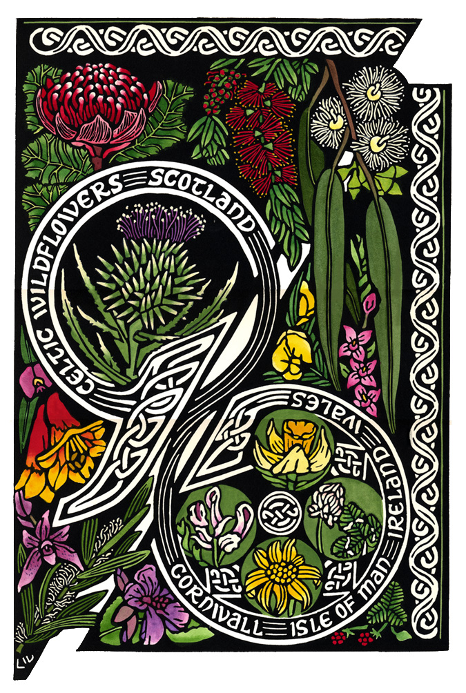 The research included contacting photographers in the UK who graciously helped me out with some of the more obscure wildflower images. I visited many local ‘Open Gardens’ that Spring as many of these contained flowers from the UK and managed to get photographs as resources. Knotwork is interesting and for the idea of the never-ending ‘circles or lines’ – I imagined and even used small ropes! For the Glen Innes piece knotwork I thought of Gum leaves intertwining.