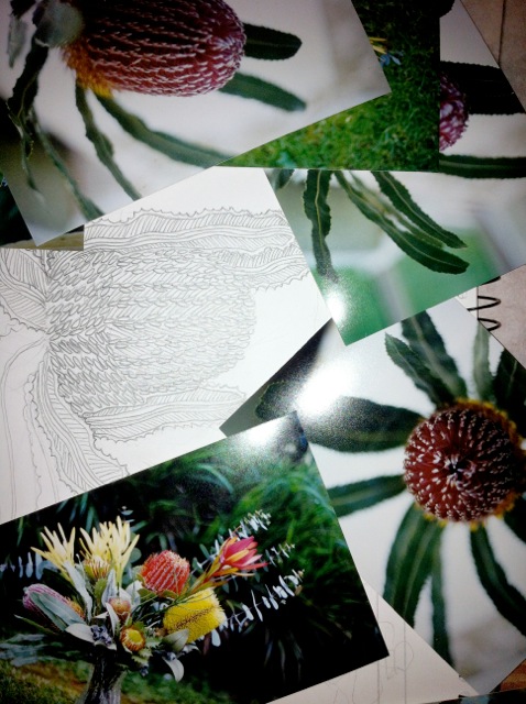 I am currently working on drawings for new designs for greeting cards including a design using Banksia menziesii. I am using both photographs and the actual flowers as reference points for the designs.