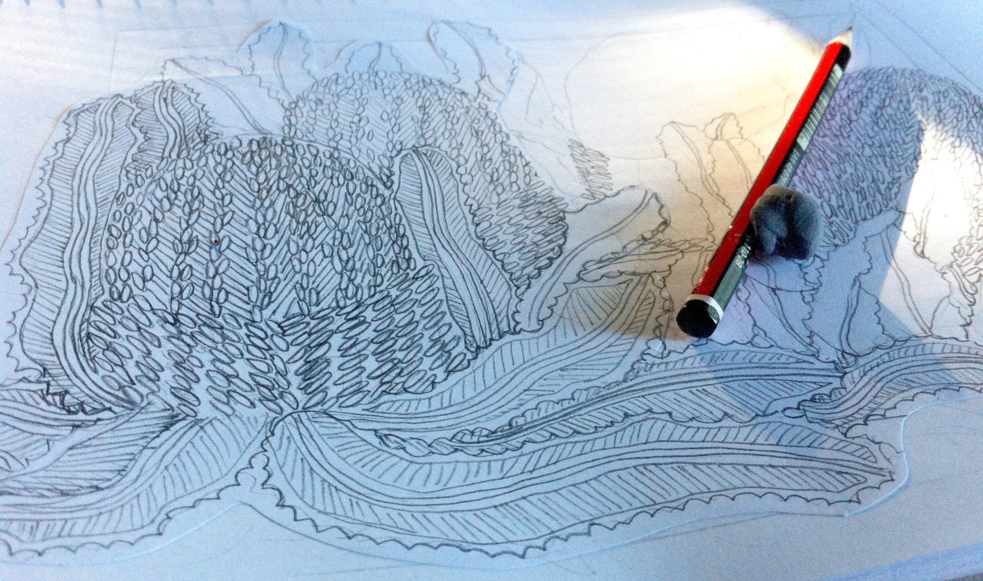 If you follow me on twitter – by clicking the follow button in the left margin or https://twitter.com/#!/LynWeir – you will have been updated as to the progress of the Banksias – Banksia menziesii – design.