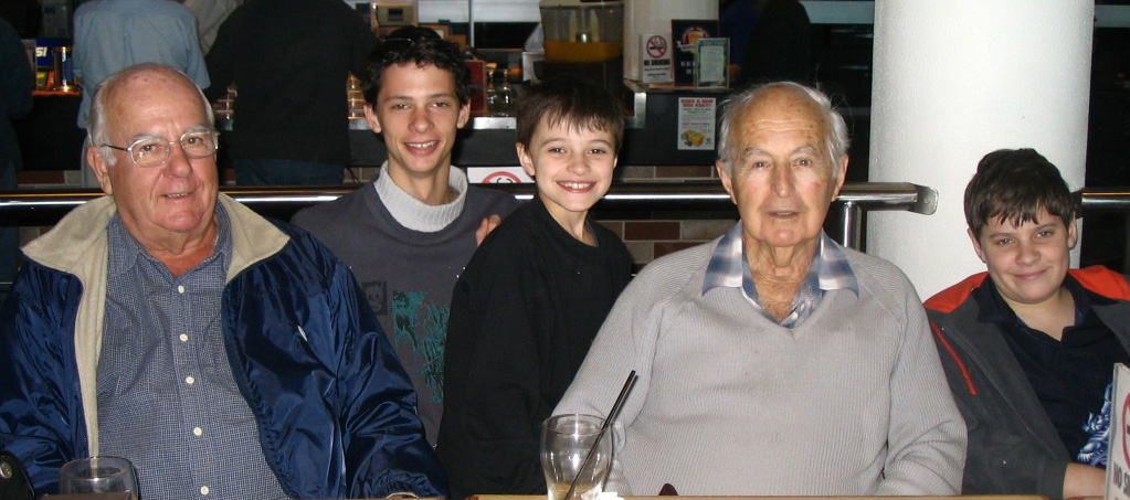 Manning greatest regret was not being kept on in the Airforce after the war – in his notes in bold capitals underlined he wrote “AIRFORCE DID NOT WANT“. One of his greatest joys had been flying aircraft. He came back settled back into Australia married Judy and became an accountant. He was a father to 3 children (one died just after birth) and a Grandfather of 4. My three sons loved their ‘Da’ as they called him and especially loved their time spent with him when he moved up to be close by us for the last few years of his life. Here are our three boys with both their much loved Grandfathers – their other Grandfather ‘Pa’ is a lot younger than Manning but served as part of the National Service (Nasho’s) in the 1950’s..