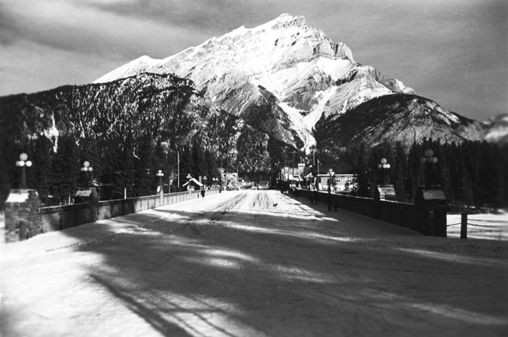 Right in the middle of the Rockies – tremendous mountains – unsurpassed in beauty. Mountain still snow capped – permanent. Mountain waterfalls & streams everywhere. This type of country all day – very disappointed in the scarcity of wild life, saw one moose, one deer and a few birds 7 ducks little else. Stopped at Banff, a beautiful tourist resort & saw a Mountie, red-coat. Next big town Calgary where we change for Penhold. Three hours leave at Calgary. Looked town over, still quite light here at 9.00pm. Ice skating just opened again, indoor, now off the Penhold.