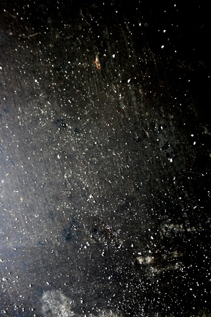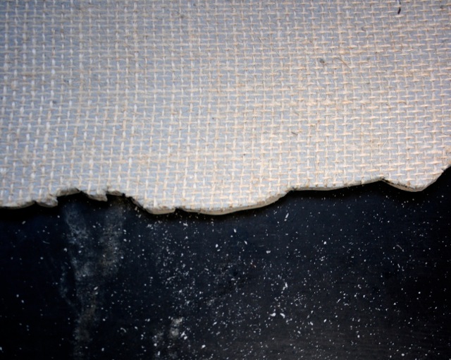 So you can see on my dark printing table the fine chips (and some larger ones) that potentially could ruin a print for you – costing you money because as you know the acid free rag paper is not cheap! There is nothing more frustrating than lifting the print back off the linobock to find one of those white rings indicating a lino chip or piece of dirt!