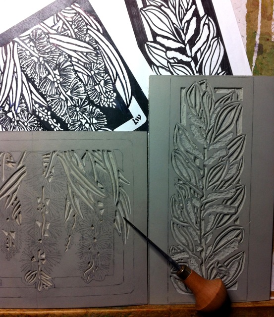 Here is a small image of some of the carvings – they are a couple of small designs I was working on back in 2012. The one on the left is from a series of 15x15cm square designs and the one of the right is from a series of 12 ‘Deco’ designs. I had been having long-term problems carving for a long while but I did 2 days carving this week and all was fine!! Yippee!! Hoping to start on some large blocks and multi-panel designs I designed at the end of last year very soon!
