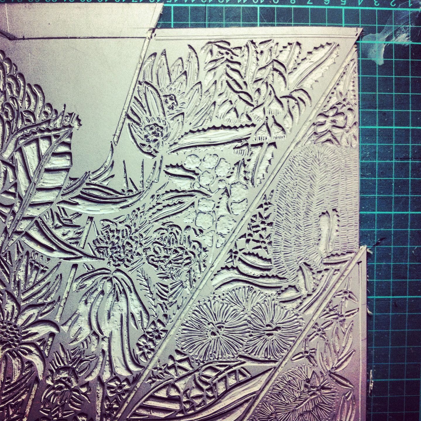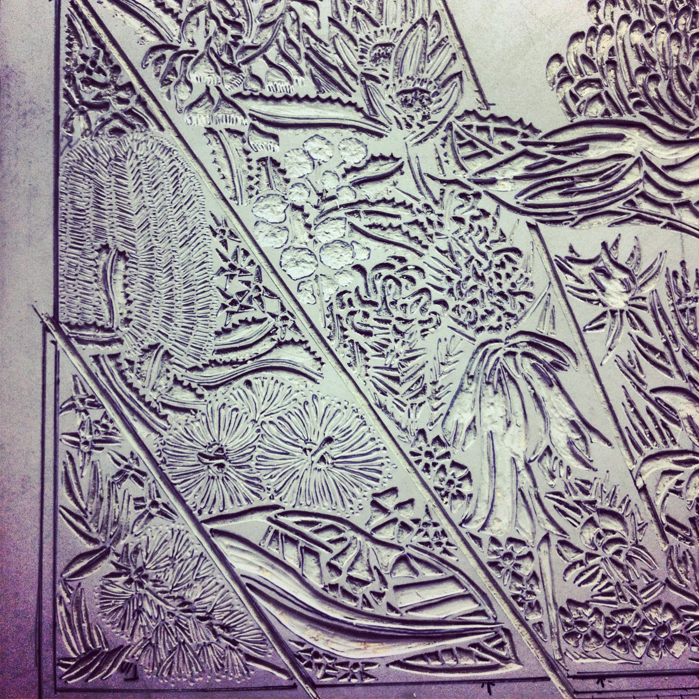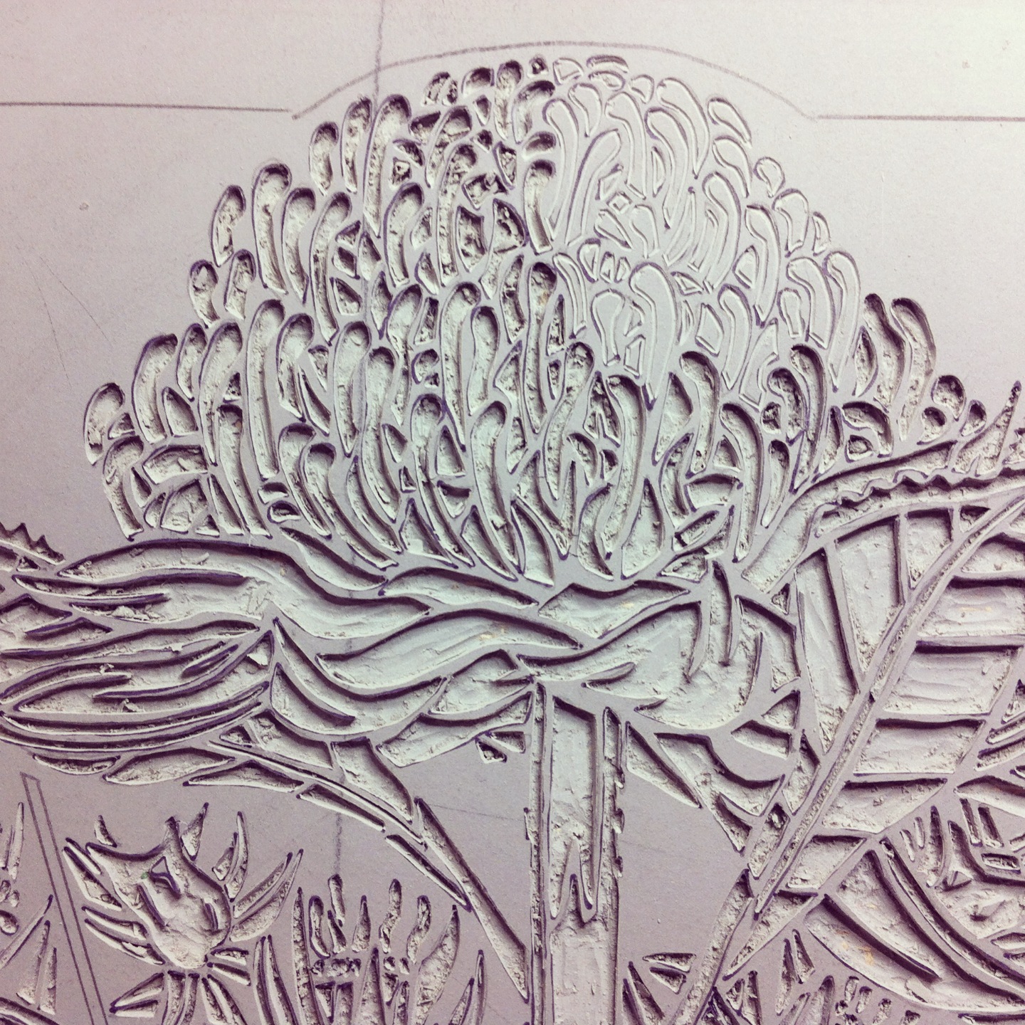 Started with the final central waratah that needed carving. I have already carved the outline with a final linocut carving tool to start. I then use a v or u gouge tool to take out the centre of each of the sections outline. The carved out parts create the white spaces of the work which I can then handcolour of I choose to.