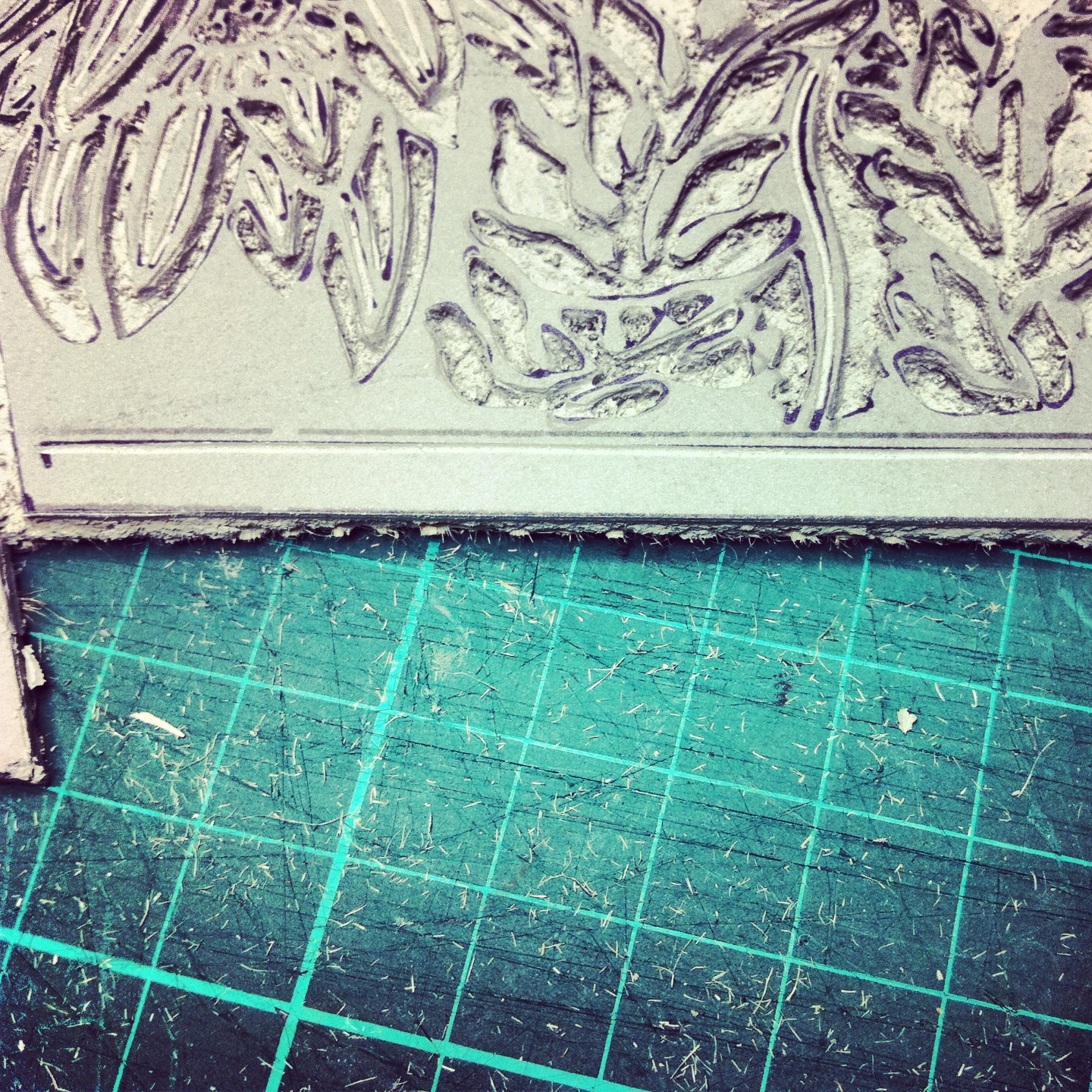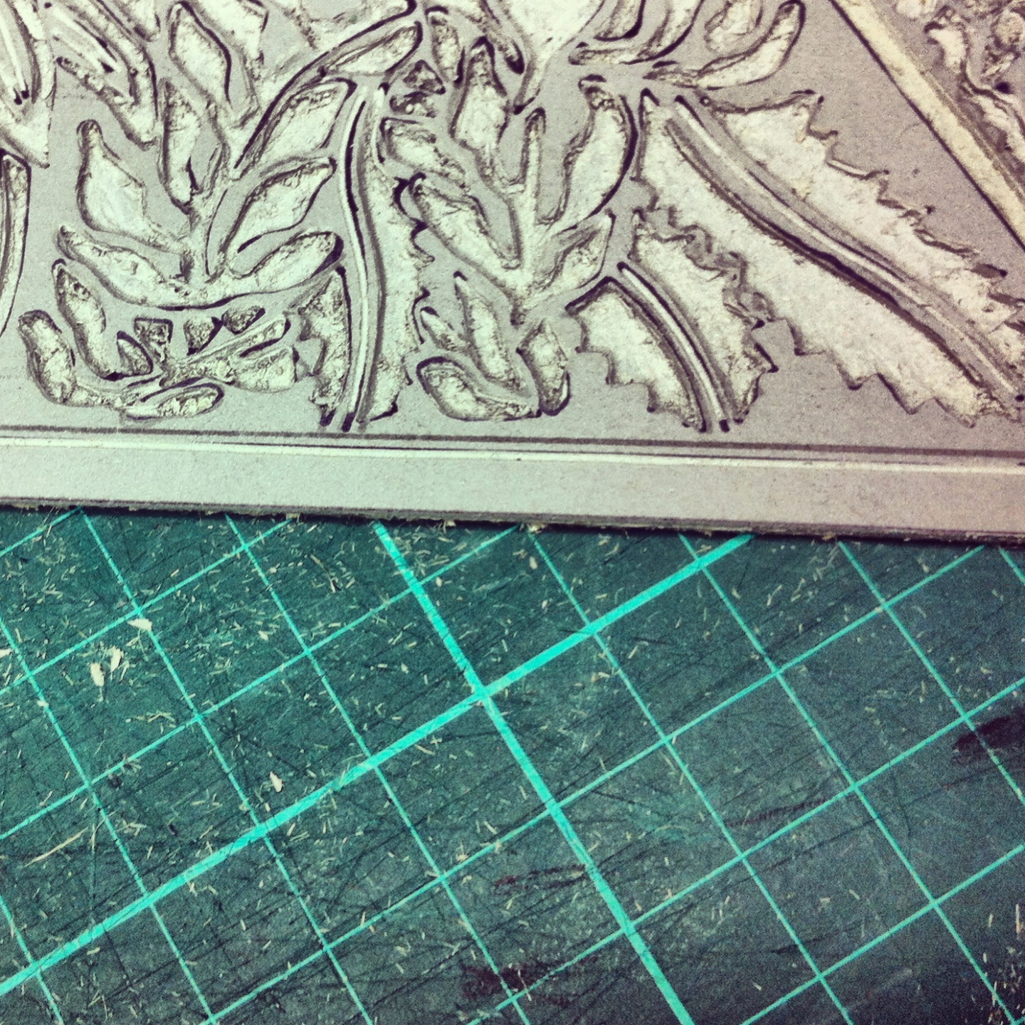 I tend to get a bit freaked out at this point. I measure carefully but lino does not always cut straight up as it, unlike wood, has some flexibility in it. So I took my time and went slowly as possible to carefully cut these lines. I want the panel structure of this design to be as straight and even as possible to get the Deco Art influence and the mirror from that era reflected in the design as closely as possible.