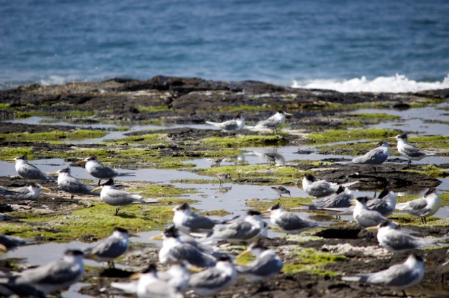 In amongst the Crested Terns out towards the sea were Ruddy Turnstones which I managed to not get a photo of, but did get a rather distant photo of Red Necked Stints. They are the small brown birds in the middle of this photo of the surrounding Crested Terns.
