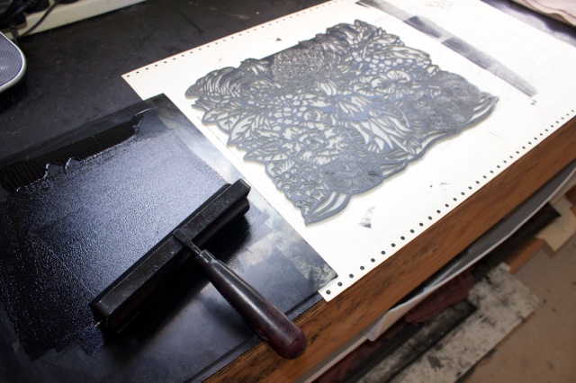 A roller is used to ink up a glass plate and then roll over the lino block to transfer the ink. It is important to get an even thin layer of ink to transfer the image to the paper.