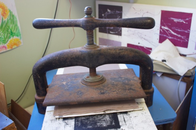The paper is placed on top of the lino block and a felt is placed over that to help distribute the weight of the press evenly & not damage the paper & lino block in the process. I use a small wind down book press which lowers a heavy plate onto the block.