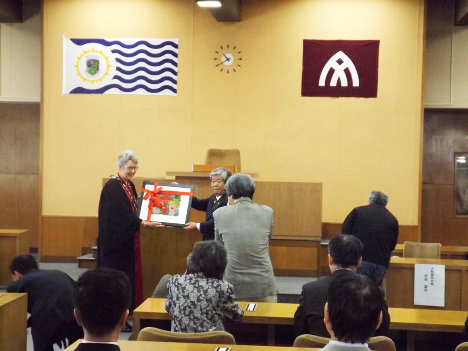 It was commissioned as a gift for Lismore City Council’s Sister City – Yamato-Takada – for the Lismore City Council Mayor and General Manager’s visit which is currently underway and joins the previous purchase by Lismore City Council and Yamato-Takada 50th Anniversary of the first Sister City relationship program in August 2013. My linocut was presented yesterday by Mayor Jenny Dowell of Lismore City Council to Mayor Yoshida of Yamato-Takada Council.