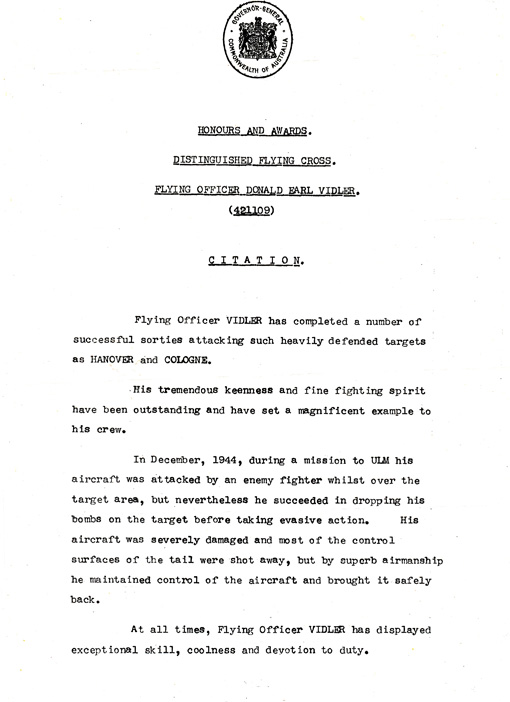 Donald Earl Vidler was my Mum’s first cousin & was a Flight Officer/Pilot in WW2 who was awarded the Distinguished Flying Cross – DFC. He was my second cousin & someone who we would see regularly as he lived in the Sutherland Shire not far from us. My memory of him is of a kind, genuine, caring and honorable man with a keen sense of humour and mischief. He was originally a Spitfire pilot but later transferred to Bomber command where he went on to fly Lancaster bombers. I have been told that was not a usual airforce career progression – once you were in either in fighters or bombers it was not often you transferred between them. He flew with distinction & I have told more of his service previously on this blog – click here to see the original post. The value of his service is highlighted also within the comments within that blog post where people knew Don both here in Australia & when he was in the RAAF in the UK, have added additional information & remembrances of him.