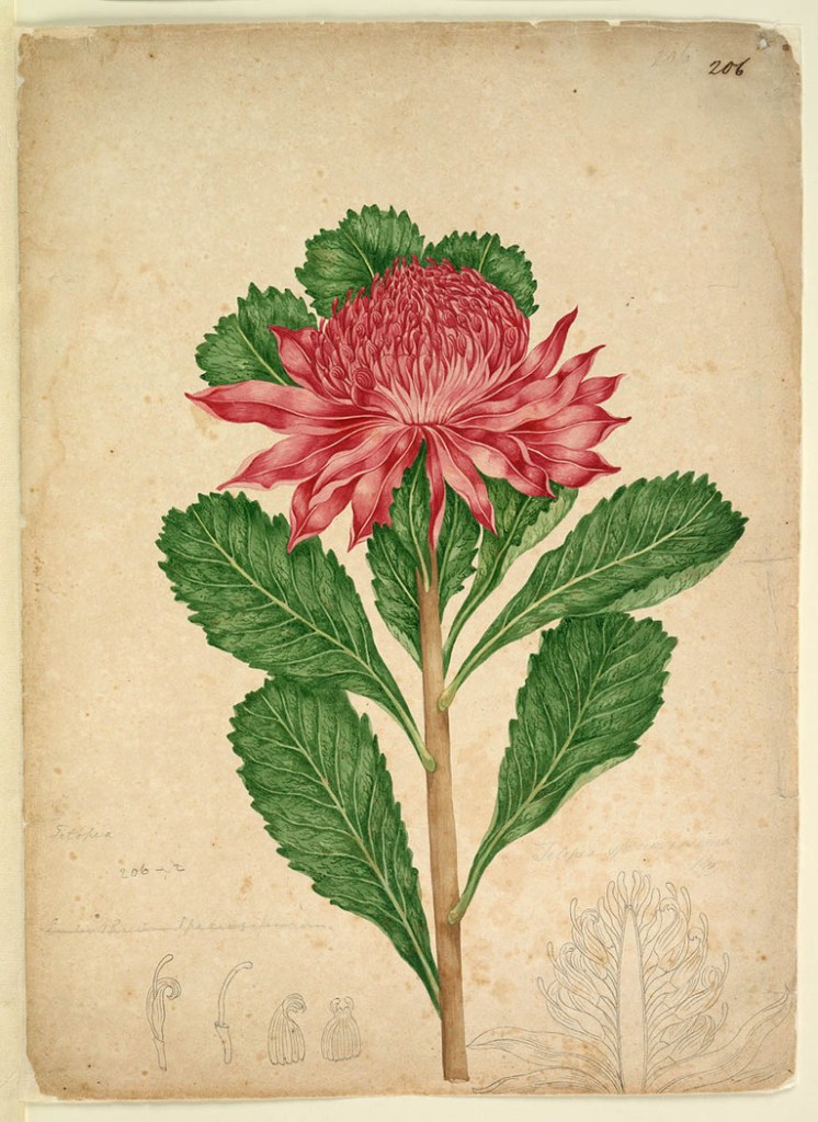 Love this drawing of a Waratah – Telopia speciosissima – completed in the years just after he arrived. You can see this whole sketch book at the State Library of NSW.