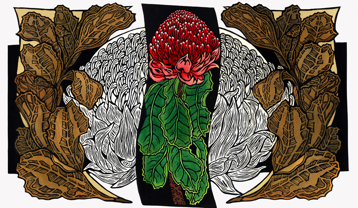 In updating this blog and making it easier to find my art diary entries about particular works I will be slowly making a landing page for each of the linocut designs. Each page will link back to previous posts of the drawing, design, carving, printing and hand colouring process that I have previously documented. This is a process of documentation for my artwork including for copyright purposes in the advent of new technologies able to reproduce artists work.