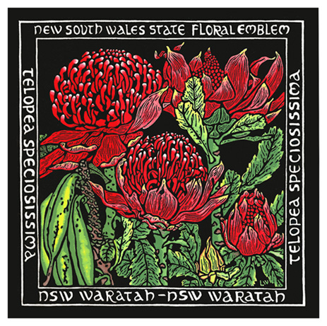 Bruce Goold renowned artist and printmaker, produced a Waratah Torch hand coloured linocut which was used as the primary image for the State of the Waratah Exhibition. Two other artists included in th SH Ervin Gallery Exhibition were Jenny Lee and Linda Jackson, well known artists with a focus on Waratahs.