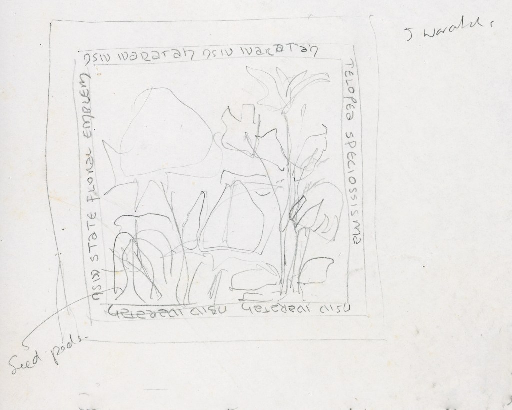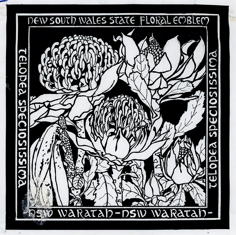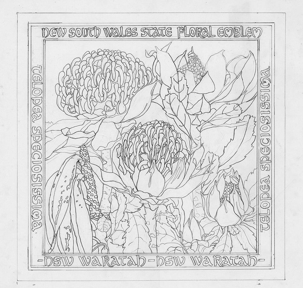 The first was the ‘New South Wales State Floral Emblem’ 2000. This design began with a small sketch idea, a detailed drawing, a design layout in black and white which became the basis to cave the linocut which was printed and hand coloured.