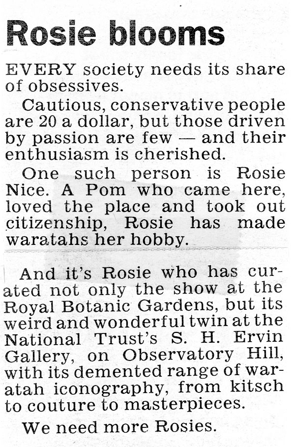 The NSW State Floral Emblem is the Waratah ‘Telopia speciossima’ and Rosie Nice curated an exhibition called ‘State of the Waratah’ at the S H Ervin Gallery in Observatory Hill, The Rocks in Sydney. The exhibition ran from 1 September to 8 October with the SH Gallery outlining the exhibition on their website stating: ‘Curator Rosie Nice has brought together an eclectic range of waratah-inspired art and craft on loan from major galleries, museums and libraries throughout Australia. State of the Waratah will explore the Aboriginal story, display wartime memorabilia, include paintings, drawings and photographs from artists such as Ellis Rowan, Margaret Preston and Bruce Goold, and showcase waratah-inspired fashion. From private collections there will be pieces never exhibited previously such as a bowl and jug featured in RT Baker’s famous book, Flora in Art in 1916.‘