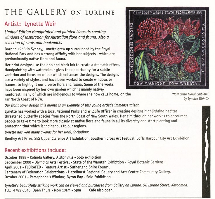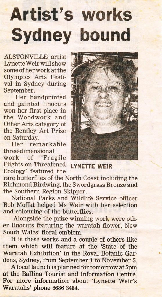 Local Newspaper Northern NSW July 2000 about the launch of these linocuts by NSW MP Mr Don Page an extremely supportive and active member for the local community. Alongside the four prints the small launch exhibition included a large work ‘Fragile Flights a Threatened Ecology’ developed in conjunction with at the time, a local NSW National Parks and Wildlife Service officer Bob Moffat.