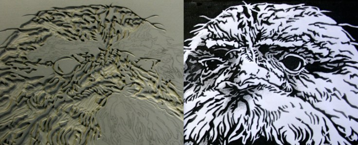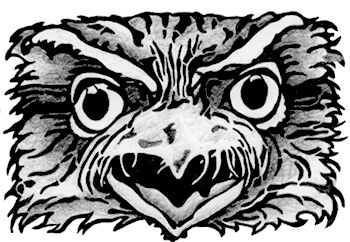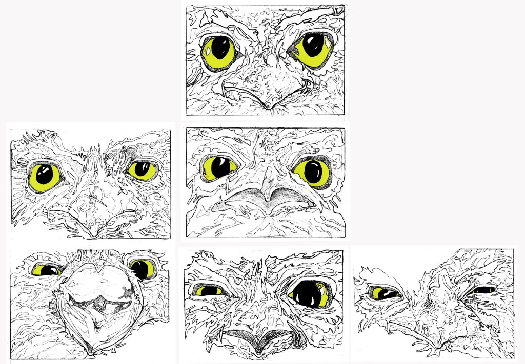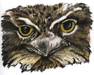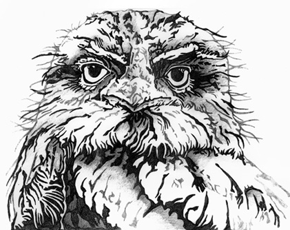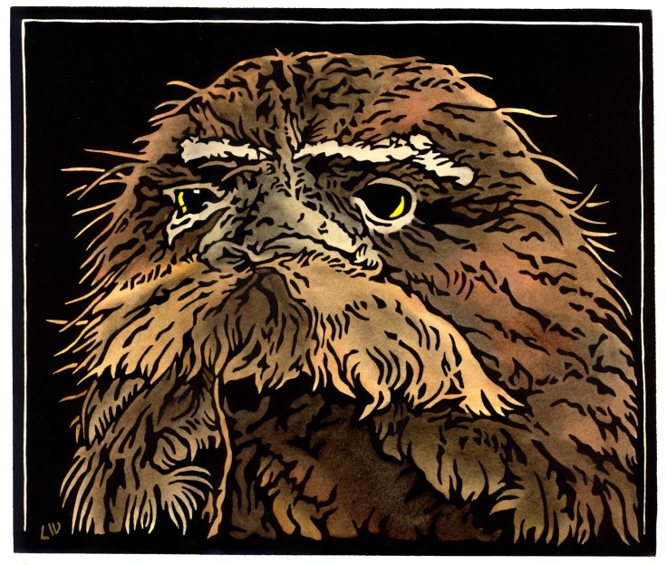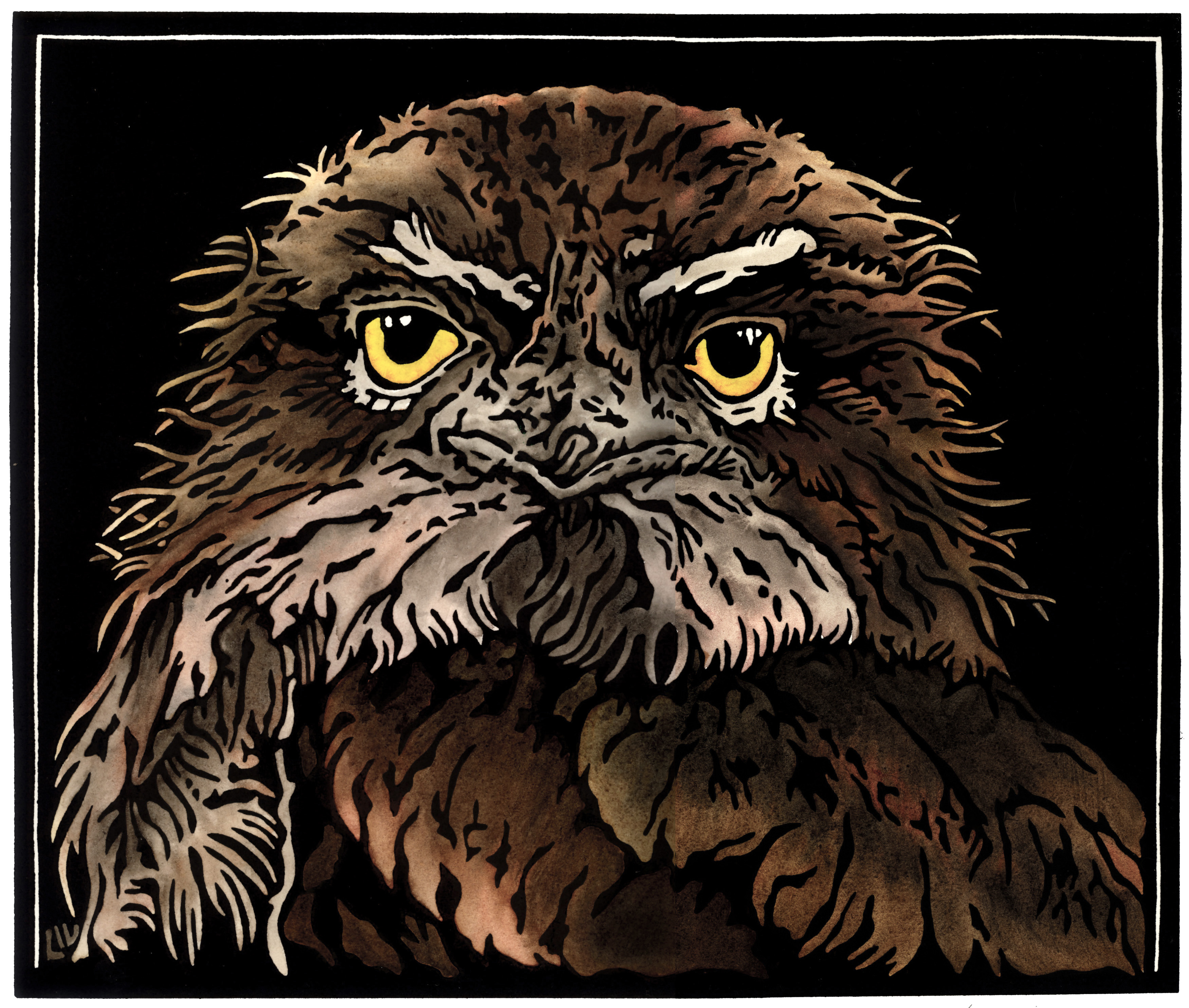 The final artwork is a series of we closely cropped images of Tawny Frogmouth facial expressions. I called it ‘Evry Move you Make … Watching You’. These started as a series of small pencil line drawings, then pencil shaded drawings, then linocut designs. I changed some, moved them around until I was happy with the final series and layout. Again this was produced in 2008. I find tawny Frogmouth facial expressions endlessly interesting and fascinating.
