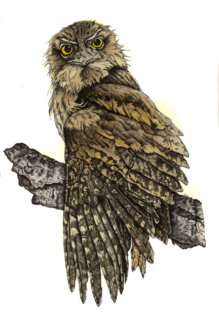Back in 2008, I hit Tawny Frogmouth peak obsession, not that it ever has really waned but 2008 was when I produced a series of artworks of Tawny Frogmouths. I have taken thousands of photos over the years and done a lot of sketches and drawings. In the early 2000’s I started writing a children’s book about Tawny Frogmouth’s, but have not ever completed it. Let’s just say it is on a very long ‘to do list!