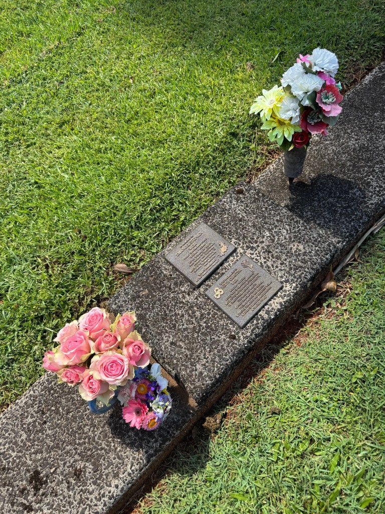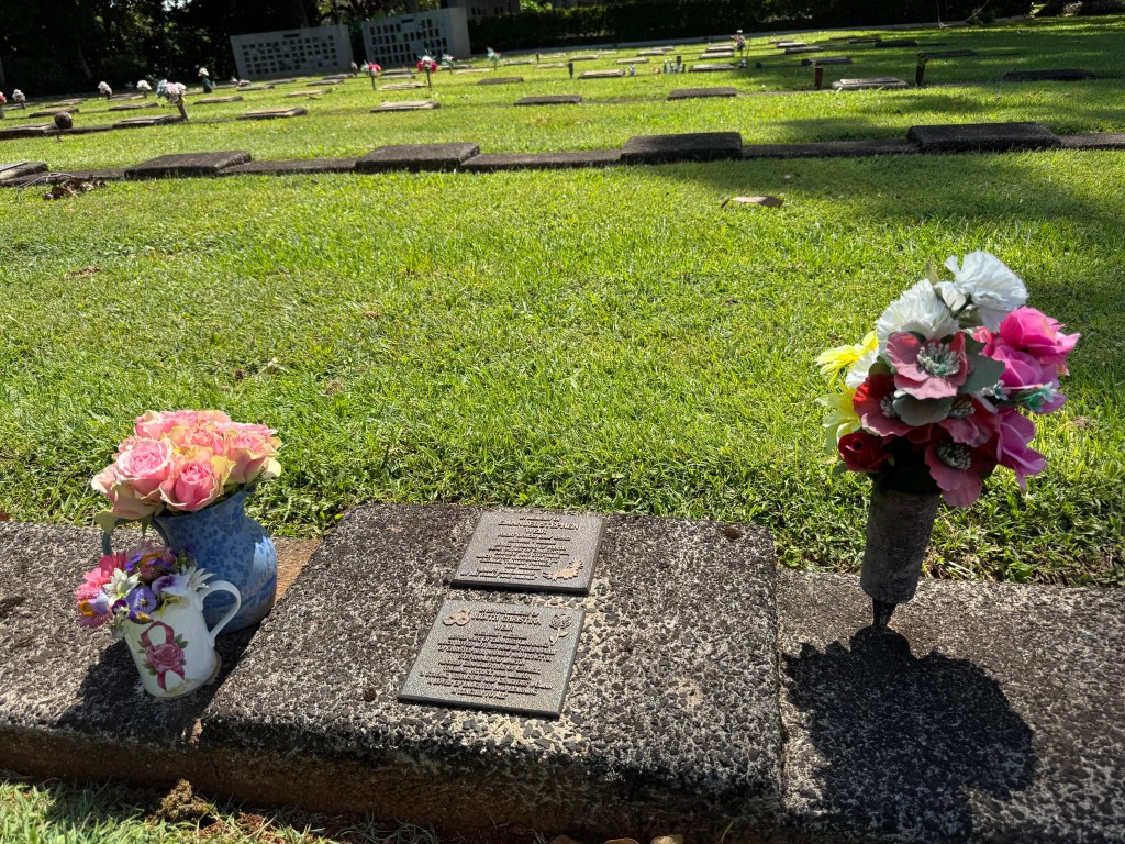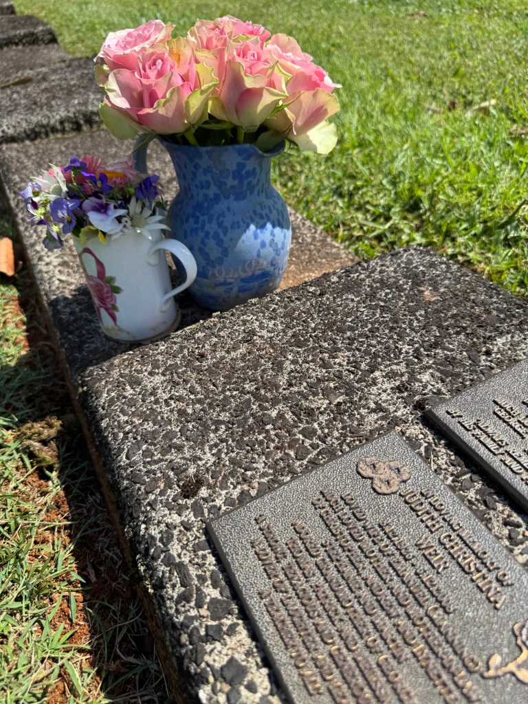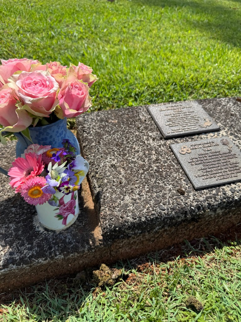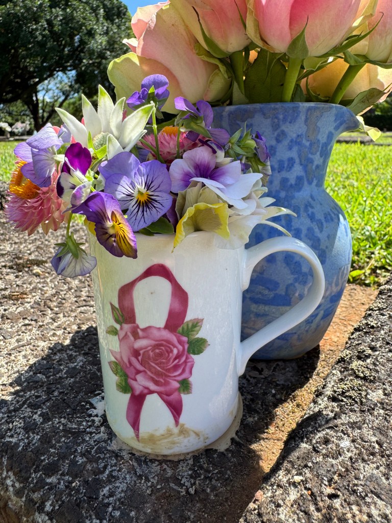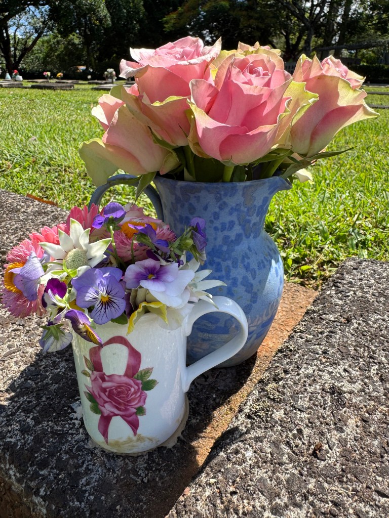 So happy 99th Birthday Judy, even though you never made it! We remembered and brought you some pink roses because you loved roses and a small bouquet of flowers from our garden including a rose and the two remaining pansies your favourite flower that I had nurtured to get to this day and some violas. We bought a blue jug because you loved blue, and a rose teacup as you always loved your cup of tea from the Anglican op shop for your flowers. We hope you like them.
